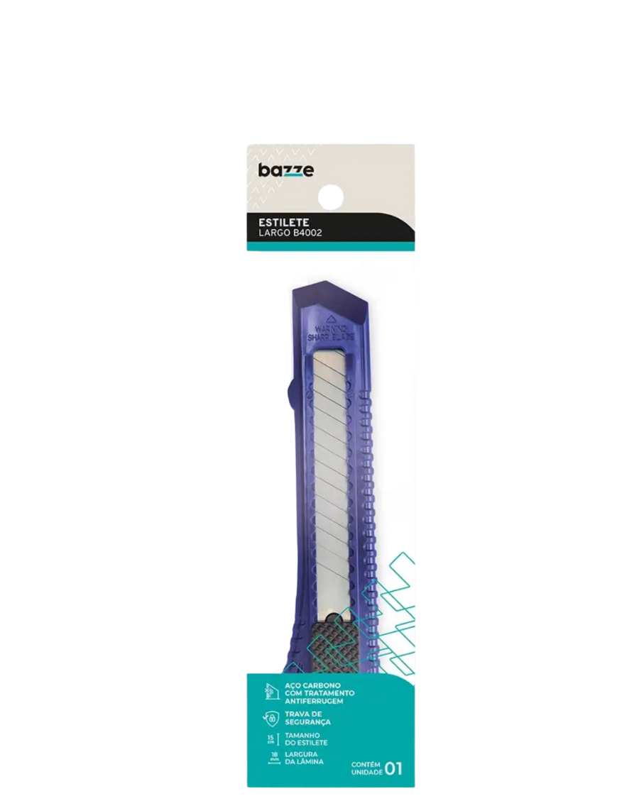 O estilete possui corpo plástico, de lâmina larga e com tratamento antiferrugem e trava de segurança.