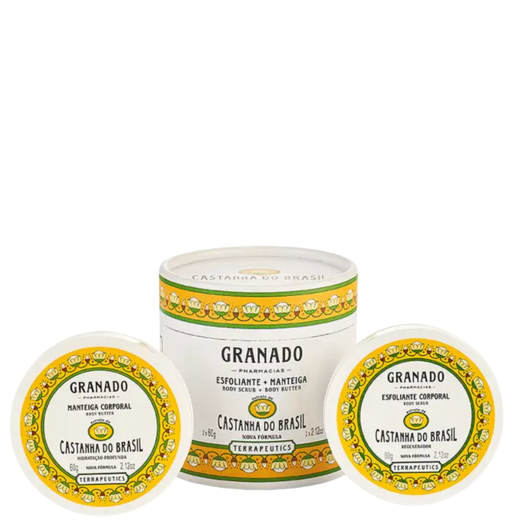 O Kit Esfoliante e Manteiga Granado Castanha do Brasil oferece um tratamento completo para a pele, com fórmulas enriquecidas com extrato natural de castanha do Brasil, que possui ações antioxidante e hidratante.