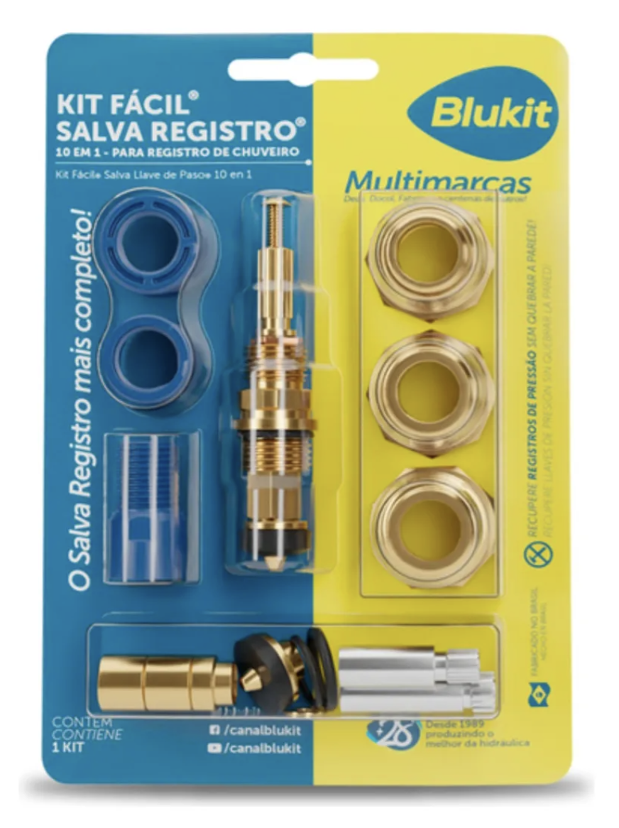 O Kit Reparo Chuveiro Fácil Salva Registro 10 em 1 é a solução com melhor custo-benefício para solucionar problemas no registro de pressão ou de vazamentos no chuveiro. Substitui o produto original com as mesmas especificações e qualidades. Suporta ambientes salinos, vibrações e altas temperaturas. Atende todos os sistemas independente da marca, modelo ou ano de fabricação.