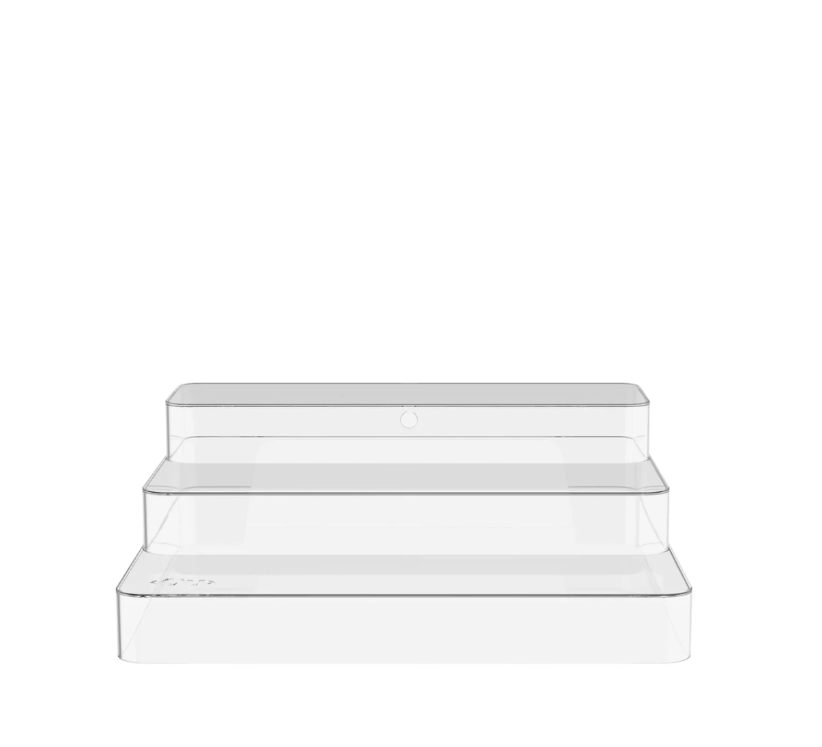Organizador multinivel em acrilico para armários, facilita a exposição de objetos e temperos, material resistente e funcional. Pode ser utilizado em qualquer ambiente.