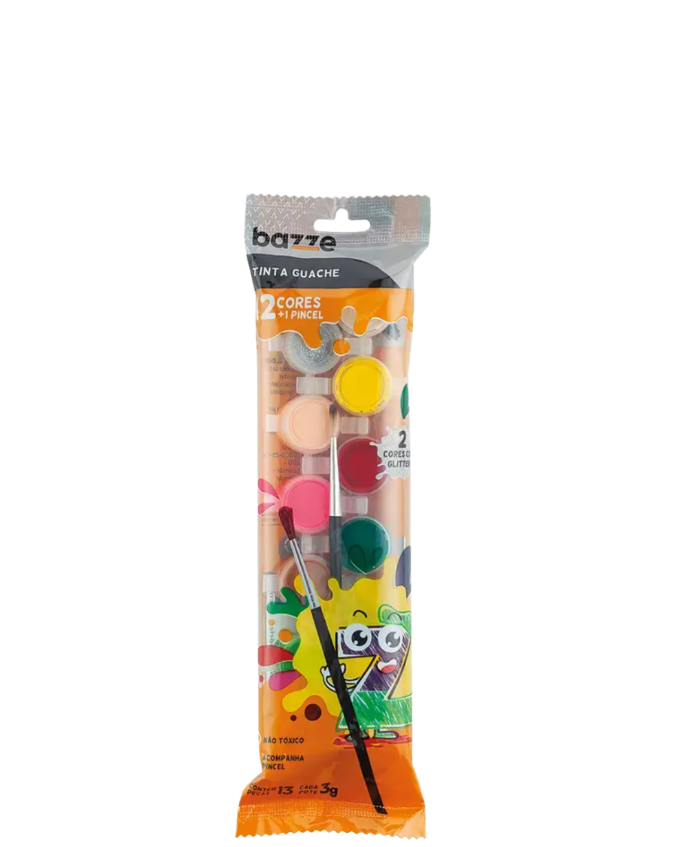 Itens do kit: 12 Cores tinta guache + 2 cores C/ Glitter + 1 pincel.